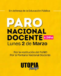 CTERA convocó a un paro nacional docente para el lunes 2 de marzo, que forma parte de un plan de lucha profundizado por la central. Según la información disponible, los docentes realizarán una medida de fuerza de 48 horas, comenzando el lunes 2.