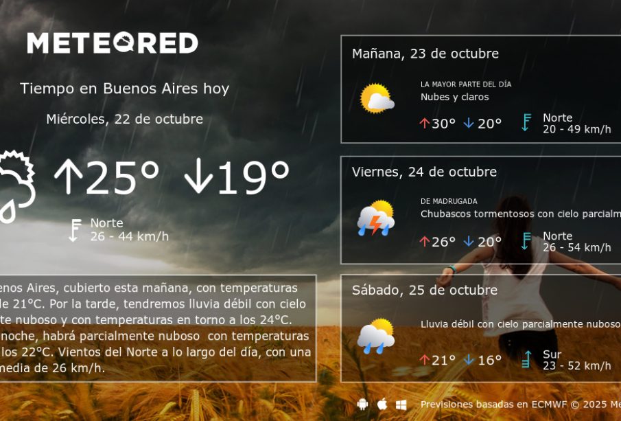 Según el Servicio Meteorológico Nacional (SMN), el pronóstico para Buenos Aires esta semana indica temperaturas que oscilarán entre los 20°C y 30°C durante el día, con mínimas nocturnas que podrían bajar a 15°C. Se prevé que los días lunes y martes sean soleados, mientras que a partir del miércoles se anticipa un aumento en la humedad y posibilidades de lluvias hacia el fin de semana.