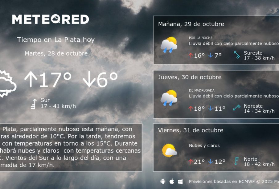 Según el Servicio Meteorológico Nacional (SMN), La Plata ha estado experimentando condiciones climáticas variables en la última semana, con temperaturas que oscilan entre los 10°C y 28°C. Las lluvias han sido esporádicas, con un promedio de precipitaciones de 15 mm en el último registro, lo que sugiere una temporada de primavera húmeda. Actualmente, se prevé un cielo mayormente nublado con posibilidad de lluvias intermitentes en los próximos días, especialmente de viernes a domingo, donde las temperaturas podrían alcanzar su punto máximo de 30°C.